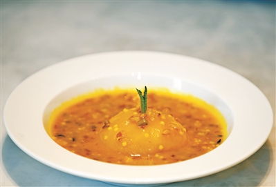 這道菜選擇泰國(guó)的西米、江西的紅米、美國(guó)的野米、東北的小米和河北的燕麥5種雜糧,預(yù)先浸泡蒸熟備用。半個(gè)蘋(píng)果削皮浸泡鹽水后蒸熟備用。將南瓜蒸熟后用破壁機(jī)打成南瓜茸,放入平底鍋,小火加熱,放入五谷雜糧慢慢推至均勻。這道菜神奇的地方,在于如果你喜歡甜,可以放糖作為飯后甜品;如果你喜歡咸味,則可以放鹽,作為代餐主食。調(diào)好味道后,放入蘋(píng)果加熱到溫度適合,就可以上碟。