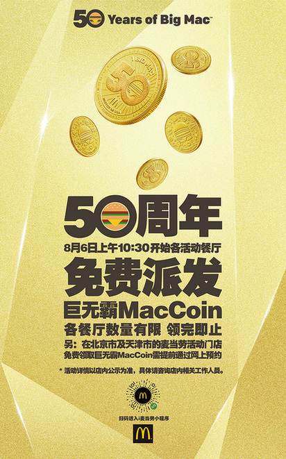 為了與中國(guó)消費(fèi)者一起歡慶巨無(wú)霸50周年,中國(guó)內(nèi)地指定麥當(dāng)勞餐廳將于2018年8月6日當(dāng)日免費(fèi)送出超過100萬(wàn)枚MacCoin。早上10:30開始,顧客前往餐廳為巨無(wú)霸唱出生日歌[ 北京市和天津市的顧客需2018年8月4日上午9:00起在“i麥當(dāng)勞”微信小程序提前預(yù)約,方可于8月6日10:30起在指定麥當(dāng)勞餐廳領(lǐng)取。],即可獲得MacCoin一枚,圖案隨機(jī),送完即止。北京市和天津市的顧客需2018年8月4日上午9:00起在“i麥當(dāng)勞”微信小程序提前預(yù)約,方可于8月6日10:30起在指定麥當(dāng)勞餐廳領(lǐng)取。顧客可以分享與收藏,也可以在2018年12月31日前憑MacCoin在中國(guó)內(nèi)地、美國(guó)、荷蘭、新西蘭、巴西等全球超過50個(gè)國(guó)家和地區(qū)參與活動(dòng)的麥當(dāng)勞餐廳,免費(fèi)兌換巨無(wú)霸一個(gè)。