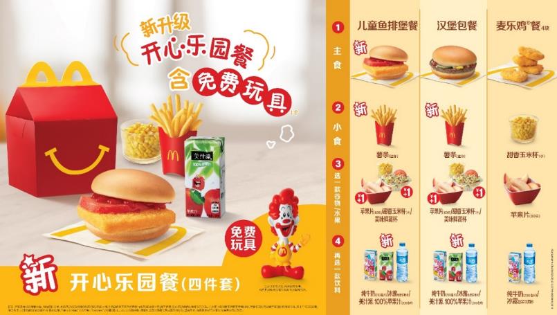 在確保產(chǎn)品美味與質(zhì)量的前提下,麥當(dāng)勞一直致力于實(shí)現(xiàn)更少鹽、更好油、更多蔬果谷物。新開心樂(lè)園餐參考了“麥當(dāng)勞全球兒童營(yíng)養(yǎng)標(biāo)準(zhǔn)”,并充分考慮了中國(guó)兒童的膳食營(yíng)養(yǎng)需求。新套餐從三件套升級(jí)為四件套,包括一份主食 (可選肉類蛋白來(lái)源:魚、牛、雞)、一份小食 (可選迷你薯?xiàng)l、玉米杯)、一份蔬果 (可選蘋果片、鮮蔬杯、玉米杯)和一份飲品 (可選純牛奶、水、100%蘋果汁 )。