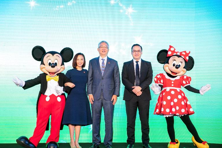 麥當(dāng)勞中國(guó)董事會(huì)主席張懿宸先生(中)、麥當(dāng)勞中國(guó)首席執(zhí)行官?gòu)埣乙鹋?左二)、迪士尼中國(guó)影業(yè)及品牌管理副總裁及總經(jīng)理徐隆立先生(右二)、米奇和米妮(左一及右一),共同見(jiàn)證合作
