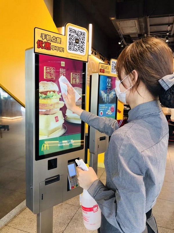 目前全國所有的麥當(dāng)勞餐廳啟動上班員工測溫流程,并提高員工洗手消毒頻次,全國餐廳全員佩戴口罩。在餐廳為顧客提供免洗洗手液,對所有餐廳的通風(fēng)系統(tǒng)和顧客常接觸的設(shè)施,強(qiáng)化消毒并增加頻次,包括大門把手、自助點(diǎn)餐屏、樓梯扶手、柜臺臺面、取餐區(qū)、桌椅、餐盤、兒童椅、兒童樂園等。