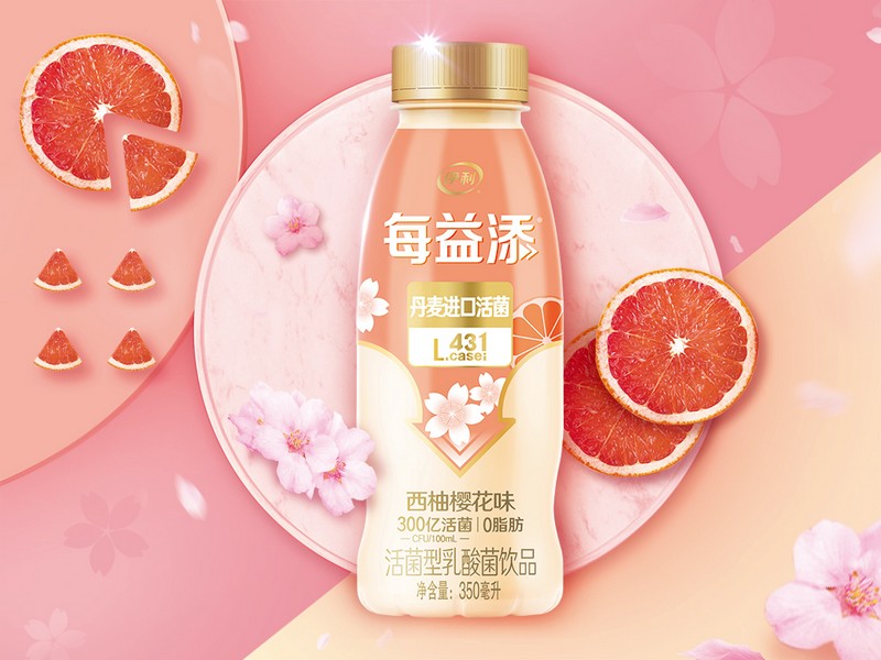 “西柚和櫻花的結(jié)合,花果搭配清新豐富。包裝上,在整體保持每益添品類視覺基調(diào)的一致性的基礎(chǔ)上,添加了花果設(shè)計元素。視覺顏色上傳達了櫻花和西柚的混合特征,櫻花的粉和西柚的橙結(jié)合,元素搭配上采用‘小即是多’的原則,幾朵櫻花一片西柚表現(xiàn)了每益添‘快樂簡單無負擔(dān)’的愿景?!庇?8位產(chǎn)品研發(fā)和市場調(diào)研方面的專家組成的評委團,圍繞感官體驗、理念創(chuàng)新、消費者溝通與整體感受等維度,對每益添西柚櫻花創(chuàng)新口味飲品進行了評鑒,并給出這樣的評審語。作為伊利旗下唯一專注低溫活性乳酸菌飲品的品牌,每益添始終堅持助消化的功能打造,其每100毫升富含300億的丹麥進口專屬活菌,從2018年首創(chuàng)百香果創(chuàng)新口味至今,屢創(chuàng)低溫活乳新佳績,引領(lǐng)低溫活乳發(fā)展新潮流。