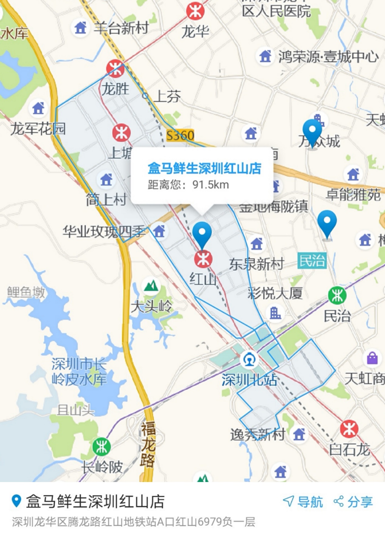 近年來,隨著深圳發(fā)展重心北拓、深圳特區(qū)一體化進程加快,即便是在傳統(tǒng)意義上的深圳關外,在盒馬紅山店的配送范圍內,已經有一家沃爾瑪、兩家華潤萬家等大賣場,還有十幾家錢大媽和一個農貿批發(fā)市場,各類線下零售和社區(qū)買菜業(yè)態(tài)也在該區(qū)域快速發(fā)展。