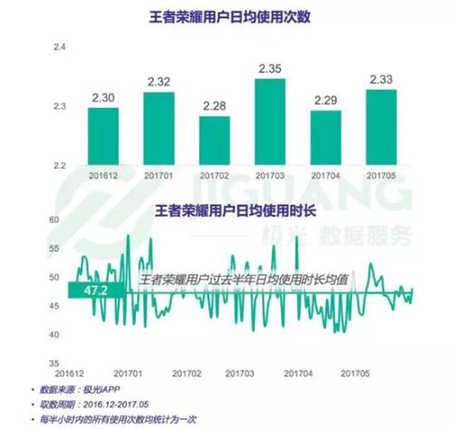 根據(jù)極光大數(shù)據(jù)的統(tǒng)計(jì),《王者榮耀》用戶白天游戲高峰時(shí)段為12:00-13:00,占比為6.97%;晚間游戲高峰為21:00-23:00,共占比13.63%在過(guò)去的半年里《王者榮耀》日均使用次數(shù)在2.3次左右,日均使用時(shí)長(zhǎng)基本在40~55分鐘這一區(qū)間。從此處來(lái)看,其用戶使用情況并沒(méi)有達(dá)到一個(gè)與常規(guī)游戲差異巨大的程度。