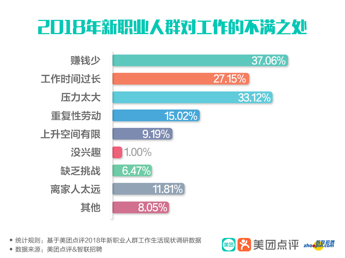 對比智聯(lián)招聘《2018年白領生活狀況調研報告》來看, 他們的不滿原因也與普通白領大體相近,他們不僅關注薪酬,也關注個人成長、工作壓力、沒時間陪家人問題。但整體來看,新職業(yè)人群在經(jīng)濟基礎仍屬薄弱的情況下追求加薪和減壓,更多的聚焦在個人問題上,而普通白領還關心企業(yè)發(fā)展前景和職位晉升空間是否受限等問題。