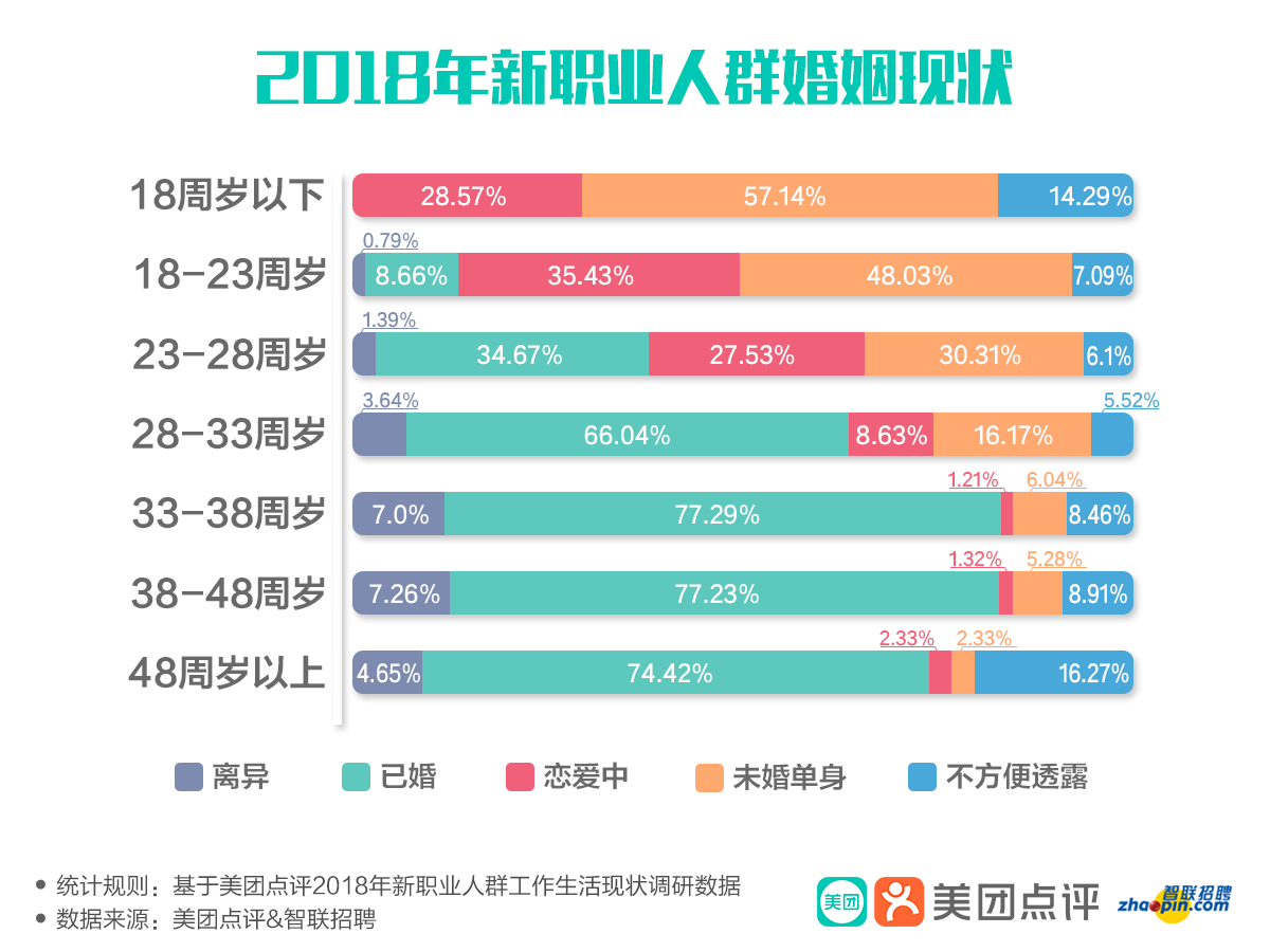 據(jù)《人民日報》報道,近30年來,年輕人晚婚的現(xiàn)象越來越明顯。在新職業(yè)人群中,婚姻狀態(tài)也符合了這一社會趨勢。數(shù)據(jù)顯示,在新職業(yè)人群中,僅僅有34.67%的90后(23-28周歲)已經(jīng)結婚,85后(28-33周歲)的已婚率則達到了66.04%,到了80后(33-38周歲),已婚率提高到了77.29%,這個數(shù)據(jù)符合大眾的普遍認知。