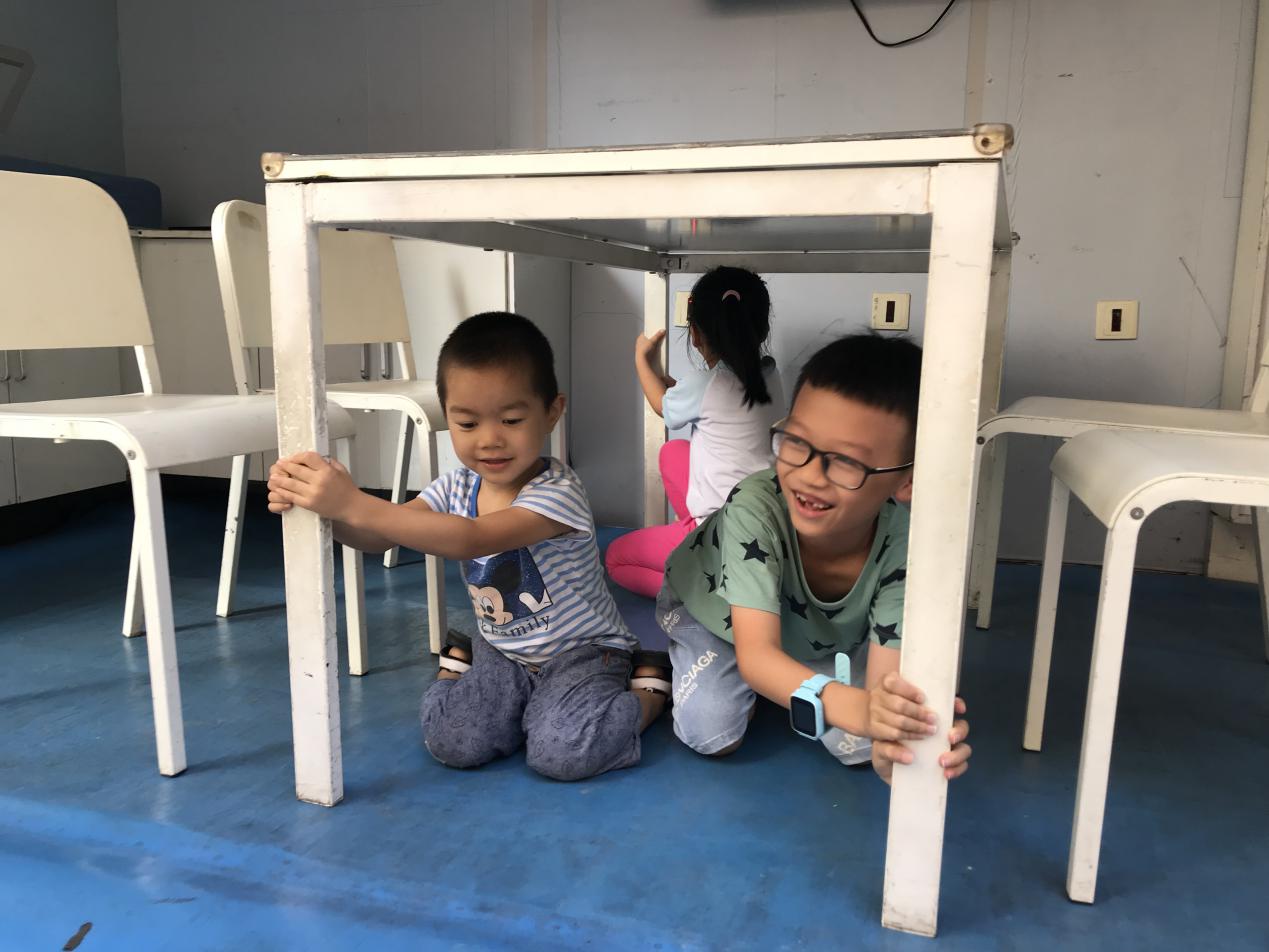 兒童平安訓練營活動共有5個版塊,分別是動感地帶、火眼金睛、鐵壁鋼手、浮力盔甲、應急包。動感地帶活動版塊的主體是地震體驗平臺,通過安全教育車的地震體驗功能,社區(qū)居民成功學會地震躲避知識要點:規(guī)避易倒塌、易破碎、已墜落三類物品;桌下/床下躲避跪、躲、抓三大要點。浮力盔甲是當身邊發(fā)生溺水或者存在溺水隱患時,可以利用身邊常用的物品比如礦泉水瓶和衣服制作緊急救生衣。鐵壁鋼手是災害發(fā)生、救援難以及時到達情況下,利用身邊的物品,對手臂骨折者進行簡易包扎?;鹧劢鹁κ窃谠S多大地震、火災和意外傷害中,教會學生認識一些室內、室外的常見安全隱患。