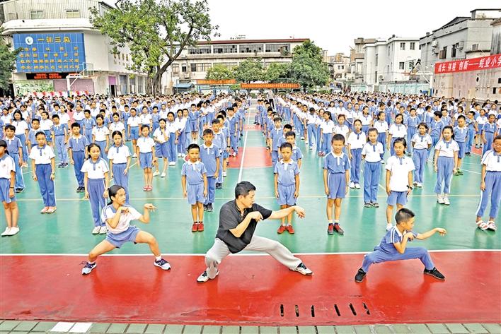 當(dāng)天,利用課間陽光體育的時間,蠔業(yè)小學(xué)1000余名學(xué)生在校內(nèi)饒有興趣地接受了華林派武術(shù)操的教學(xué),華林螳螂拳代表性傳承人冼潤長師傅詳細(xì)地講解了武術(shù)操,并實地示范。華林派武術(shù)操是“華林螳螂拳”代表性傳承人冼潤長針對青少年所創(chuàng)編,融入了螳螂拳的武術(shù)元素,深受學(xué)生的歡迎?;顒硬粌H讓孩子深入了解優(yōu)秀傳統(tǒng)文化,還讓孩子“武”起來,益于舒緩學(xué)習(xí)壓力。