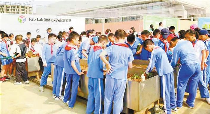 8年來,隨著生態(tài)體驗校本課程不斷升級改造,教學樓中庭不僅有水稻田,還開發(fā)了蔬果園、野果園、生態(tài)池等體驗空間。每個樓層的走廊上種上了百香果、金銀花等植物,教學樓的樓頂上也被開發(fā)利用,所種植瓜果蔬菜、花木、中草藥等植物品類達100多種,建成了一片面積達8000平方米的學生體驗式實踐基地,這為孩子們提供了得天獨厚的體驗學習空間,使他們能夠親歷種植過程,認知生命的成長規(guī)律,也使得基地四季都能夠服務于教育教學。