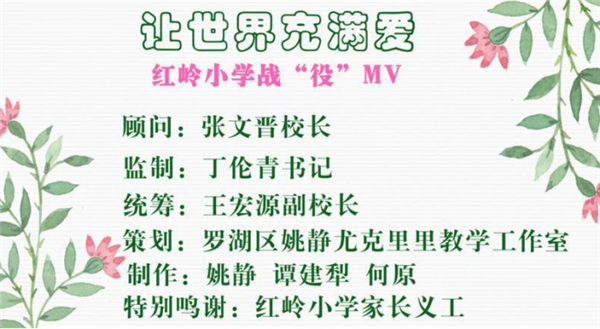 經(jīng)過學校老師、家長們的共同努力,3月23日,全長6分零6秒的紅嶺小學戰(zhàn)疫MV《讓世界充滿愛》順利完成。該片通過紅嶺小學微信公眾號首發(fā),目前,已在深圳晚報、晶報、深圳新聞網(wǎng)等多家主流媒體平臺傳播。