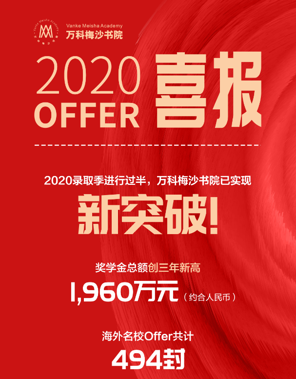 2020申請(qǐng)季還未結(jié)束,梅沙學(xué)子已收獲494封海外名校錄取Offer,獎(jiǎng)學(xué)金累計(jì)約合人民幣1,960萬(wàn)元,創(chuàng)三年新高。其中,來自美國(guó)Top100綜合性大學(xué)及文理學(xué)院的錄取通知書有356份,來自美國(guó)Top50綜合性大學(xué)及文理學(xué)院的錄取通知書有180份。