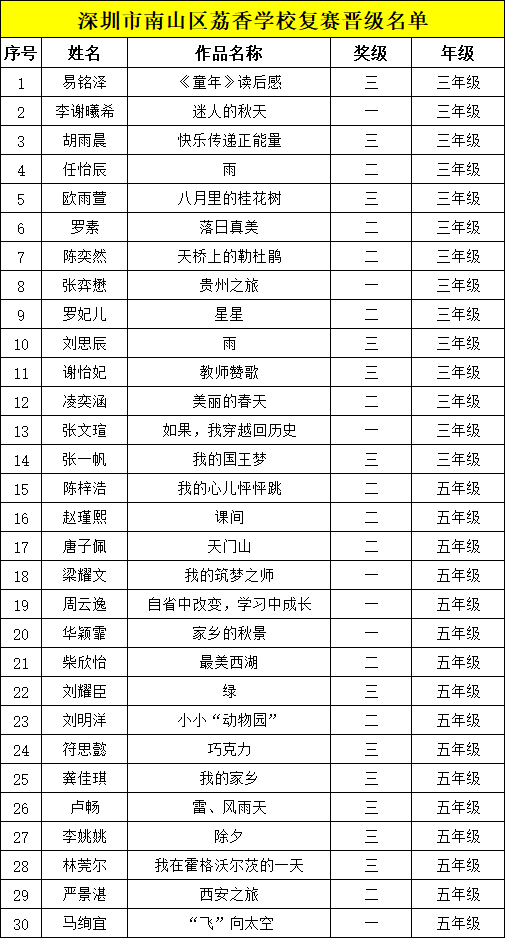 自2021年1月,活動(dòng)征稿啟動(dòng)以來(lái),獲得了深圳市廣大中小學(xué)生、教師、文學(xué)愛(ài)好者的熱烈響應(yīng)積極參與,吸引了深圳百余所學(xué)校的上萬(wàn)人關(guān)注報(bào)名?,F(xiàn)公布南山區(qū)荔香學(xué)校晉級(jí)復(fù)賽名單如下: