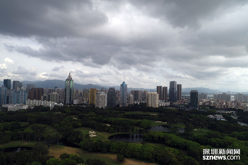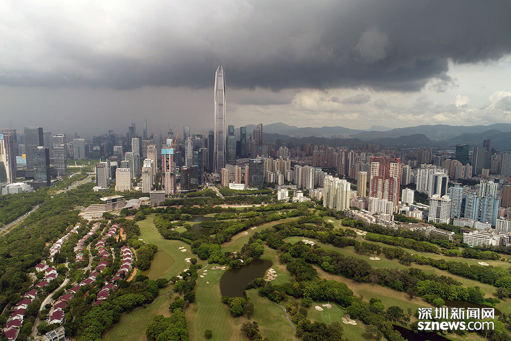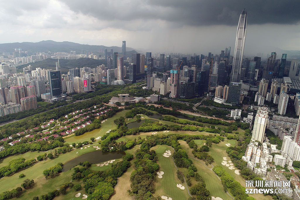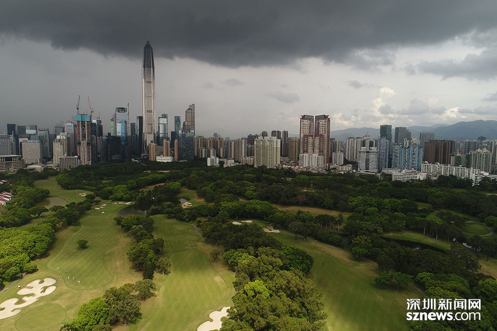 烏云籠罩下的平安大廈與深圳高爾夫俱樂部球場(chǎng)