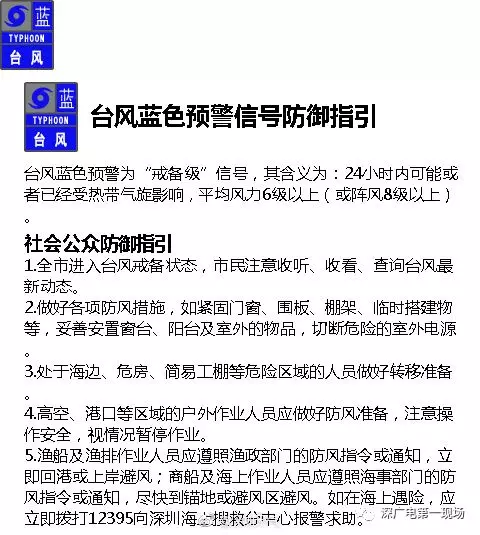 深圳市氣象臺于2018年08月14日07時30分將全市臺風白色預警升級為藍色,預計受“貝碧嘉”影響,我市陣風將增至8級以上,全市進入臺風戒備狀態(tài),落實各項防風措施,及時組織戶外、高空、港口及海上作業(yè)人員做好防御工作。