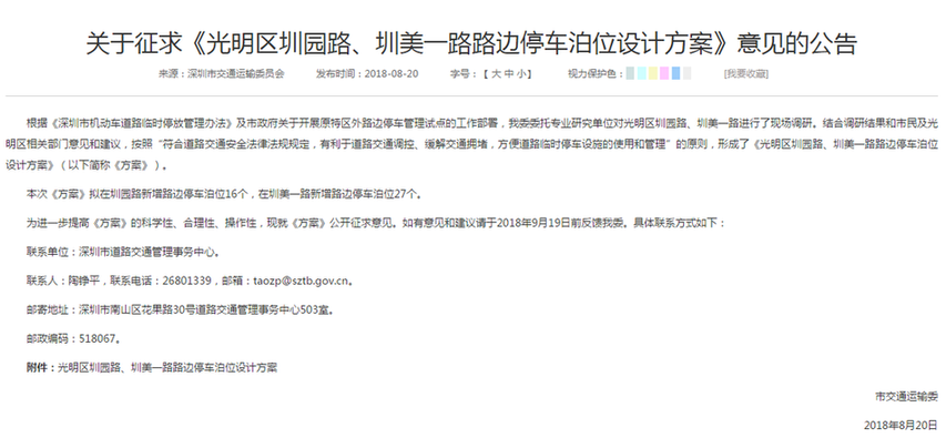 據(jù)介紹,根據(jù)《深圳市機動車道路臨時停放管理辦法》,按照“符合道路交通安全法律法規(guī)規(guī)定,有利于道路交通調(diào)控、緩解交通擁堵,方便道路臨時停車設(shè)施的使用和管理”的原則,交通部門制定了《光明新區(qū)圳園路、圳美一路路邊停車泊位設(shè)計方案》,擬在圳園路新增路邊停車泊位16個,在圳美一路新增路邊停車泊位27個。