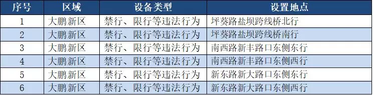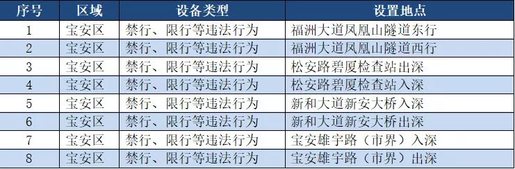 另外,重點(diǎn)整治機(jī)動(dòng)車禁行、限行等多種違法行為的交通技術(shù)監(jiān)控設(shè)備,深圳交警公布啟用87套。涉及福田區(qū)、羅湖區(qū)、南山區(qū)、寶安區(qū)、龍崗區(qū)、龍華區(qū)、光明新區(qū)、坪山區(qū)、大鵬新區(qū)等9個(gè)區(qū)域。