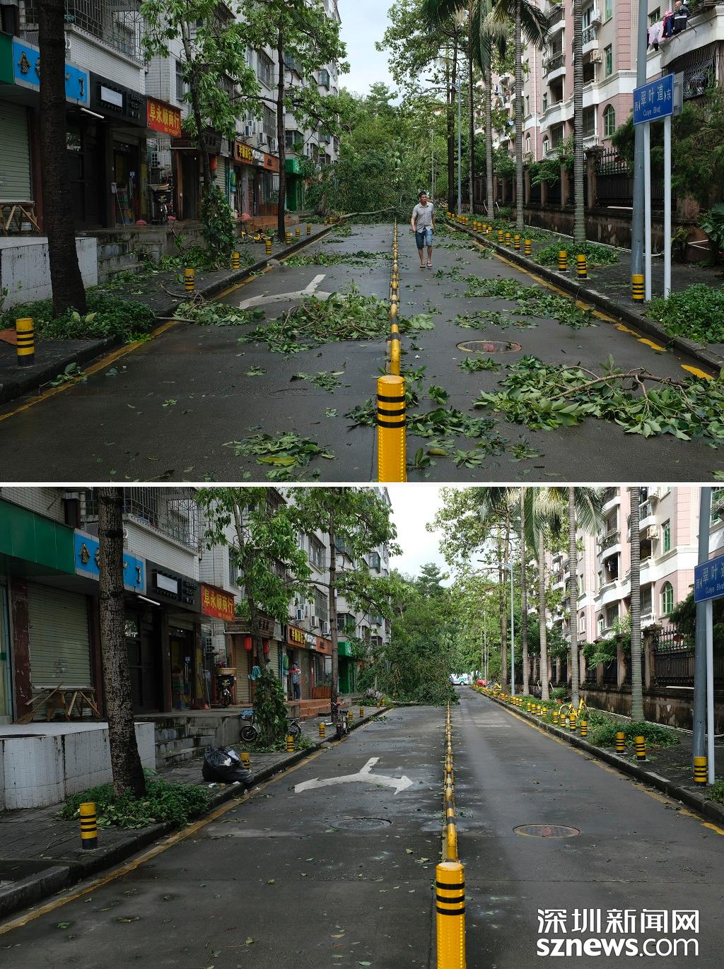 商報(bào)東二路翠葉道清理前后對(duì)比(上圖:2018年9月17日,臺(tái)風(fēng)過后,倒塌的樹木堵住路面,無法通行。下圖 2018年9月18日早上,樹木被清掃了一半,右車道可以通車)