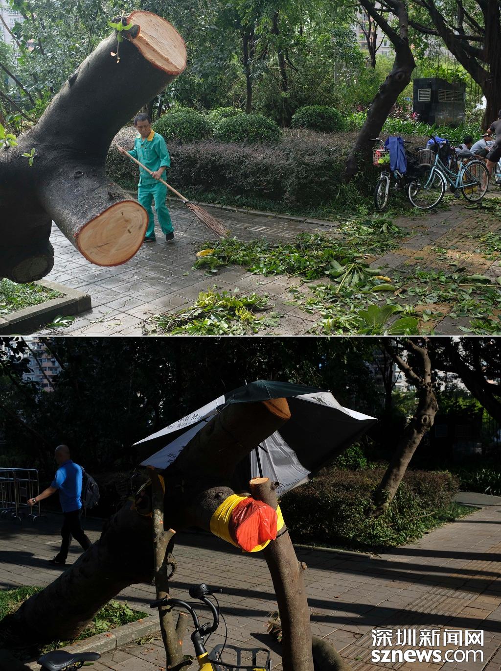 深圳新聞網(wǎng)9月18日訊(記者 楊浩翰)臺(tái)風(fēng)“山竹”已成過去式,它給深圳留下的影響卻不容小覷,倒塌的樹木和樹葉隨處可見,對(duì)城市交通造成了影響。9月17日、18日,記者兩次走訪福田石廈地鐵站以及商報(bào)二路,觀察倒塌樹木的清理情況。遍地樹葉已被清理干凈,這座城市正在快速“復(fù)原”。