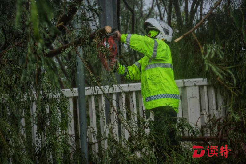 在9月18日新聞聯(lián)播中播放的臺風(fēng)現(xiàn)場畫面中,有一段正是艾力軍4人在羅沙路上清除路障過程中記錄的。當(dāng)時,艾力軍正拿起手機為同事記錄,突然一陣狂風(fēng)猛掃過來,姚書龍、陳展聰尚能在風(fēng)中勉強站住,而陳展廷卻因站立不穩(wěn)被風(fēng)吹著跑了近10米才停下。所幸,陳展廷抓住路邊的護欄才沒被吹倒。這段視頻在最近兩天也在社交軟件中廣為流傳,3位“小黃人”中2人頂風(fēng)艱難站立,1人被風(fēng)吹跑,看似“滑稽”的畫面中仔細品味,超強臺風(fēng)中堅守崗位的艱辛在視頻中盡顯無疑。