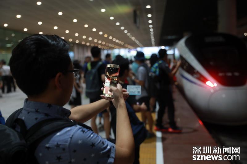 凌晨6點(diǎn)30分許,乘坐第一班深北至香港高鐵的旅客在拍照留念