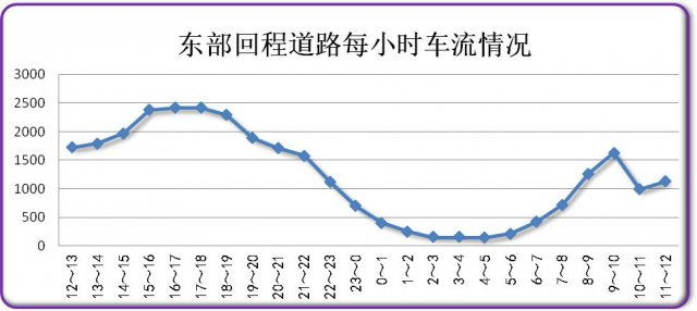 今日上午8時開始,東部回程的車輛增多,9時達(dá)到峰值,約1629輛。