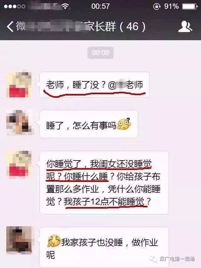 微信的內(nèi)容是這樣的,家長問:"老師,睡了嗎?"老師看了之后回了句"睡了,怎么有事嗎?"沒想到家長的回答是"你睡覺了,我閨女還沒睡覺呢?你睡什么睡?你給孩子布置那么多作業(yè),憑什么你能睡覺?我孩子12點不能睡覺?"