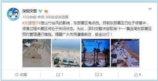 今日(9月25日)深圳市交警局宣布,由于臺(tái)風(fēng)"山竹"對(duì)東部景區(qū)破壞嚴(yán)重,目前部分景區(qū)仍在搶修中。交警蜀黍經(jīng)過(guò)綜合考慮,決定取消國(guó)慶期間前往東部的預(yù)約措施。