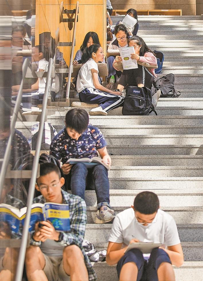 國慶長假期間,去圖書館“充電”成為不少深圳人的度假方式。由于深圳圖書館座位已滿,不少市民直接坐在階梯上閱讀學(xué)習(xí)。 深圳特區(qū)報記者 劉羽潔 攝