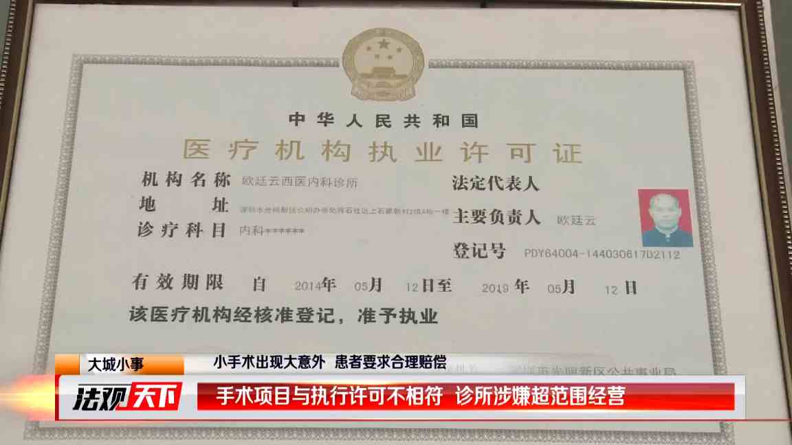 隨后,記者和醫(yī)調(diào)委吳毅主任來(lái)到了歐廷云診所,由于周女士身體尚未恢復(fù),周女士丈夫張先生來(lái)到了這家位于光明新區(qū)上石家村的診所。此時(shí)負(fù)責(zé)人并未在店內(nèi),記者在店里掛出的《醫(yī)療機(jī)構(gòu)執(zhí)行許可證》看到,該診所的診療科目為內(nèi)科,而取環(huán)手術(shù)卻是婦科項(xiàng)目,換言之,該診所涉嫌超范圍經(jīng)營(yíng)。隨后,吳主任電話與診所負(fù)責(zé)人取得了聯(lián)系。負(fù)責(zé)人表示,涉事醫(yī)生并非診所醫(yī)生,而是從其它診所請(qǐng)來(lái)的。