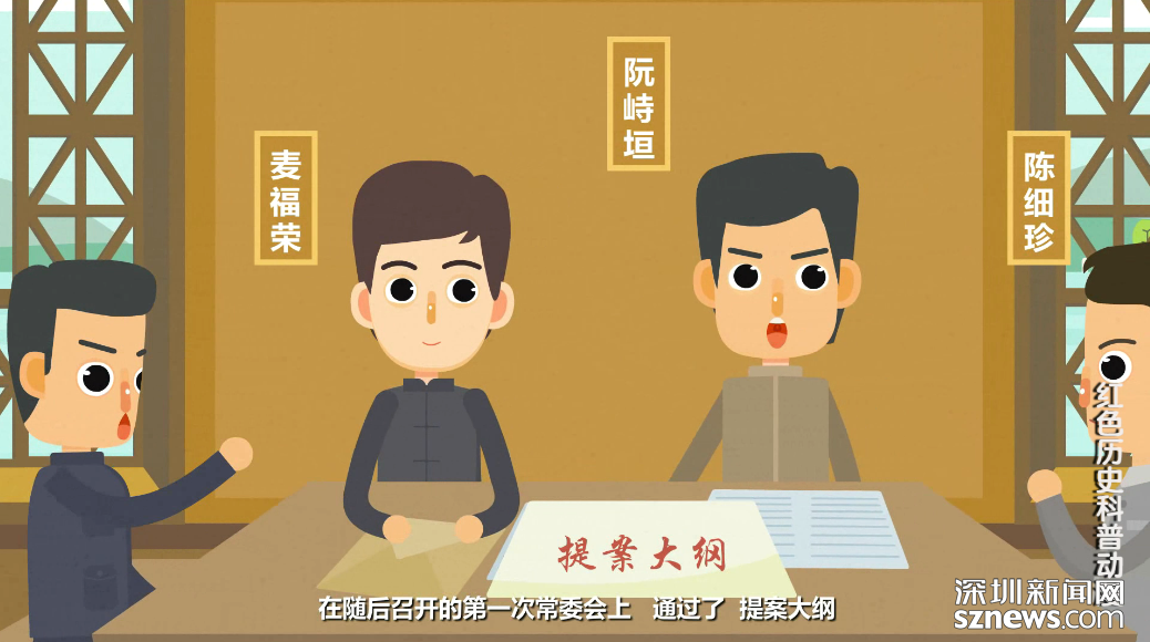 該動畫片圍繞中共寶安縣第一次黨員代表大會作了重點講述。1928年2月23日,根據廣東省委的指示,中共寶安縣委在燕川素白陳公祠召開第一次黨員代表大會。大會認真總結廣州起義失敗的原因和教訓,克服悲觀主義和盲動主義,建立新的領導核心,選舉產生了中共寶安縣第三屆委員會。在隨后的召開的第一次常委會上,通過了《提案大綱》,決定重新整頓各級黨組織,進一步發(fā)展黨員;加強宣傳工作,創(chuàng)辦農民學校、夜校、翻印《紅旗》、《布爾什維克》等黨內刊物及各種宣傳品。