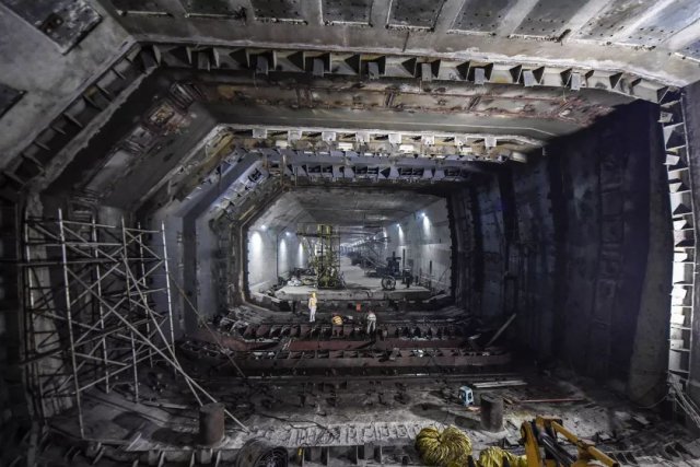 2017年7月7日,港珠澳大橋海底隧道正式貫通。圖為施工人員在港珠澳大橋海底隧道最終接頭處施工。(視覺中國)