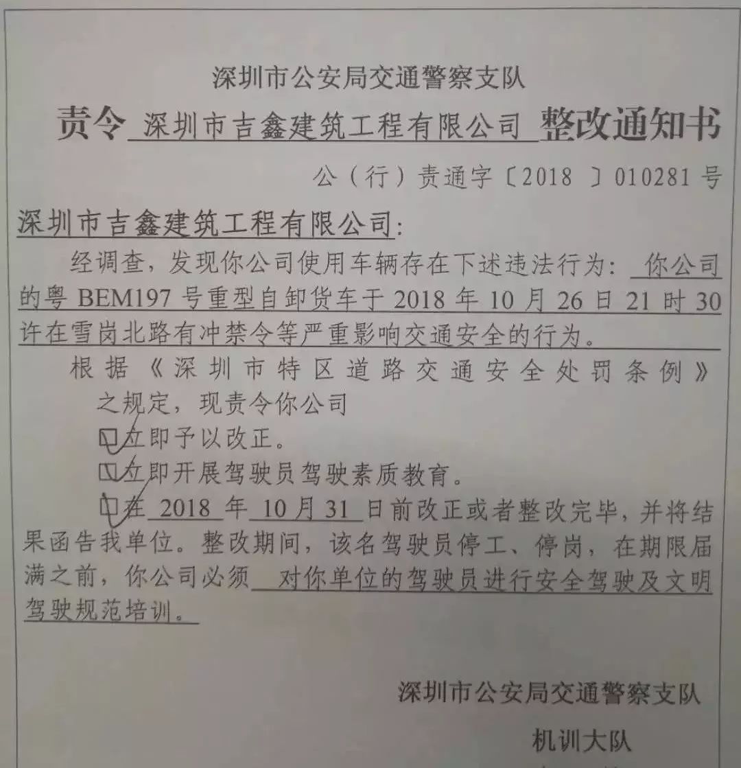 深圳交警依法對(duì)深圳市吉鑫建筑工程有限公司下達(dá)整改通知書,責(zé)令公司進(jìn)行整改: