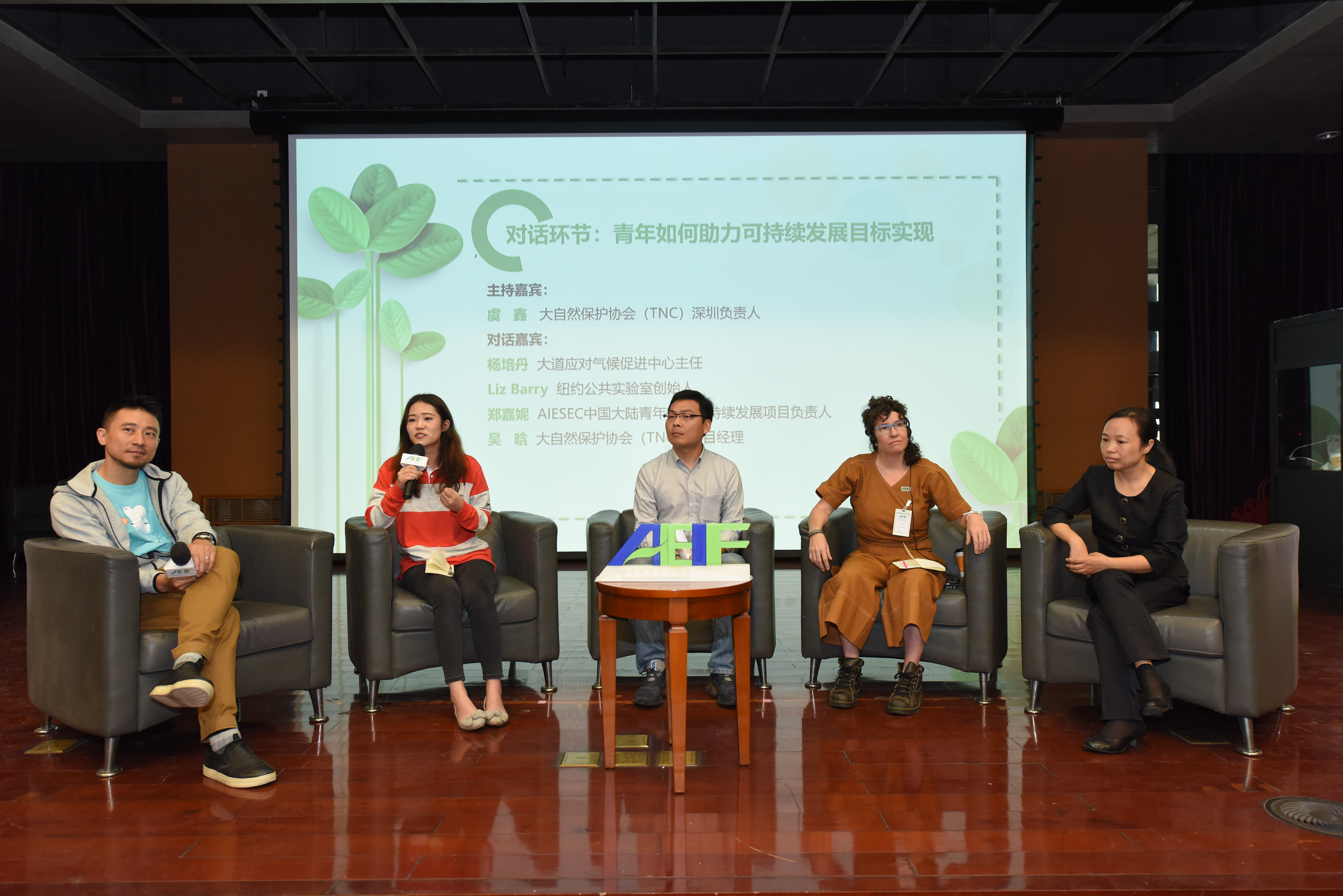 對話環(huán)節(jié)“青年如何助力可持續(xù)發(fā)展目標實現(xiàn)”共有6位嘉賓參與。在主持嘉賓大自然保護協(xié)會(TNC)深圳保護項目負責(zé)人虞鑫先生的帶領(lǐng)下,大道應(yīng)對氣侯促進中心主任楊培丹、紐約公共實驗室創(chuàng)始人Liz Barry、AIESEC中國大陸青年獻力可持續(xù)發(fā)展項目負責(zé)人鄭嘉妮、大自然保護協(xié)會(TNC)項目經(jīng)理吳晗參與了分享交流。