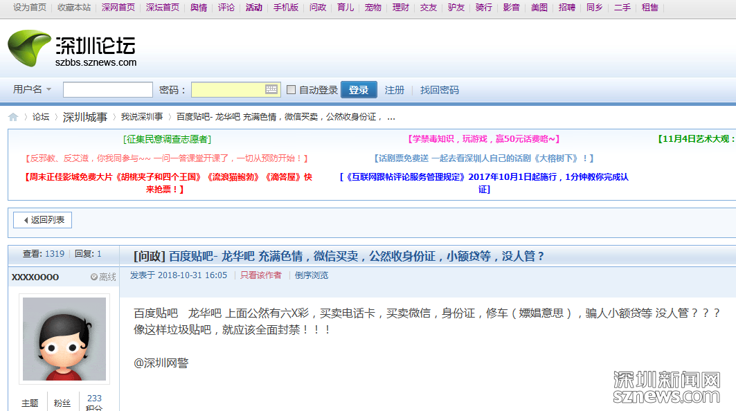 深圳新聞網(wǎng)11月5日訊(記者 何暢)“百度貼吧龍華吧上面充滿色情、微信買(mǎi)賣(mài),公然收身份證,小額貸等,沒(méi)人管?”,近日網(wǎng)友在深圳論壇上曝料百度貼吧“龍華吧”內(nèi)存在大量違法違規(guī)信息,引起網(wǎng)友廣泛關(guān)注。(網(wǎng)帖地址:https://szbbs.sznews.com/thread-3812582-1-1.html