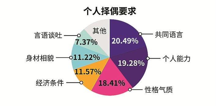 調(diào)查顯示,共同語言、個(gè)人能力、性格氣質(zhì)為單身男女在擇偶時(shí)最看重的三個(gè)方面,其次為經(jīng)濟(jì)條件、身材相貌、言語談吐??梢姡噍^于過去條件上的匹配,更重視精神上的契合。
