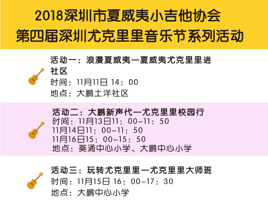 深圳新聞網(wǎng)訊 11月11日至17日,《2018大鵬文化季》音樂藝術(shù)周將迎來深圳大鵬尤克里里音樂嘉年華,也是深圳市夏威夷小吉他舉辦的第四屆深圳尤克里里音樂節(jié)慶活動,本屆嘉年華落戶深圳大鵬,與大鵬的海洋文化氣質(zhì)不謀而合,嘉年華將會有音樂會、校園行、公開課和尤克里里呼拉舞進(jìn)社區(qū)等活動,分別在大鵬中心小學(xué),土洋社區(qū),玫瑰海岸等地舉行。