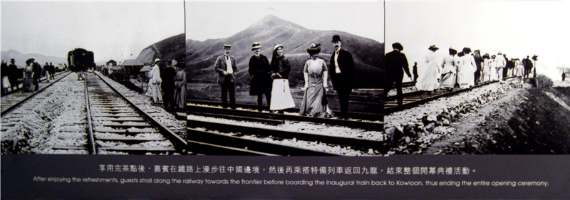 左邊第一張圖為1911年10月15日九廣鐵路全線通車現(xiàn)場,右邊兩張圖為參加通車典禮的中英嘉賓的活動(dòng)場景