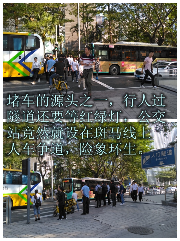 而在進(jìn)入人行隧道前,又需要等紅綠燈,且公交車站就設(shè)在這紅綠燈前的斑馬線上。“我不明白為何在交通這樣混亂的地方,要設(shè)置公交車站,也不知為何‘為難’的都是市民?!本W(wǎng)友“深圳大胡子”為這里每天通行的行人鳴不平,他希望能把招商銀行公交站原來的港灣式站臺恢復(fù),方便市民乘車,也希望能盡快恢復(fù)正常的過街通道。