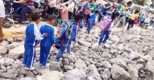 成群的學生在碎石上走過,旁邊小道擠滿三輪、電動單車(網友“伊戈達拉”供圖)