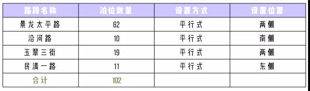 其中,桂月路擬設置泊位60個,樟閣路設置39個,榮福路設置112個,溢佳路設置59個,新丹路設置100個,福慶路設置27個,翠幽路設置79個,景龍?zhí)铰吩O置62個,沿河路設置10個,玉翠三街設置19個,民清一路設置11個,華天路設置47個,永樂路設置21個,簡上路設置63個,上芬小學路設置18個,新牛路設置21個,油聯(lián)路設置18個,黎光工業(yè)路設置22個??偣?88個“宜停車”泊位。