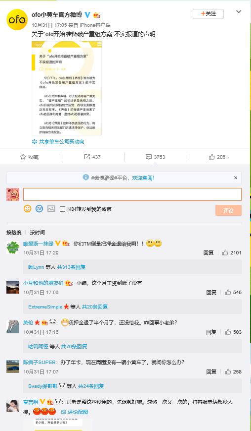 今年10月底,《界面》新聞發(fā)布題為《ofo開始準(zhǔn)備破產(chǎn)重組方案》的報(bào)道。當(dāng)日,ofo官微稱該報(bào)道嚴(yán)重失實(shí),將訴諸法律維護(hù)自身合法權(quán)益。