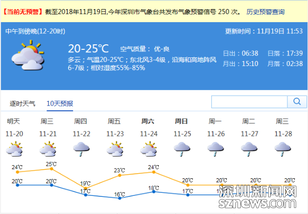 記者從深圳市氣象局了解到,19日中午到傍晚(12-20時),深圳以多云天氣為主;氣溫在20-25℃;東北風(fēng)3-4級,沿海和高地陣風(fēng)6-7級;相對濕度55%-85%,空氣質(zhì)量優(yōu)-良。