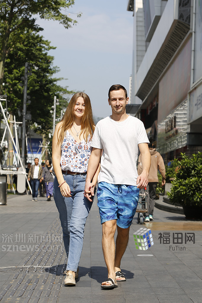 俄羅斯情侶身穿背心牛仔褲與短袖短褲,明亮的藍色依然是夏天的感覺。