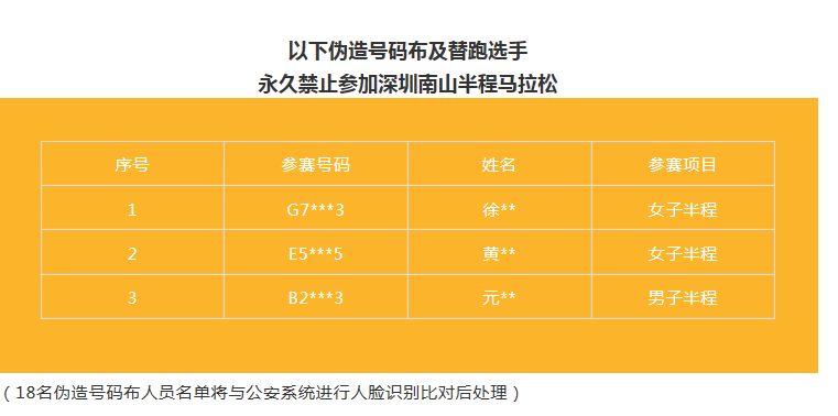 賽事組委會(huì)表示,賽后,他們也一直在整理、分析現(xiàn)場(chǎng)的照片、視頻等素材。期間組委會(huì)也已收到部分新舉報(bào),包括抄近路、套牌及替跑等行為。經(jīng)查證,在2018深圳南山半程馬拉松比賽中,根據(jù)計(jì)時(shí)芯片數(shù)據(jù)、賽會(huì)錄像、現(xiàn)場(chǎng)照片等材料證明,總計(jì)違規(guī)選手人數(shù)258人,其中偽造號(hào)碼布18人,替跑3人,其他違規(guī)行為選手人數(shù)237人(其中穿越綠化帶人數(shù)46人)。經(jīng)組委會(huì)研究決定,按照《2018深圳南山半程馬拉松競(jìng)賽規(guī)程》第7-8條規(guī)定,對(duì)258名違規(guī)選手作出如下處理,并根據(jù)要求將違規(guī)名單及處理結(jié)果上報(bào)至中國(guó)田徑協(xié)會(huì):