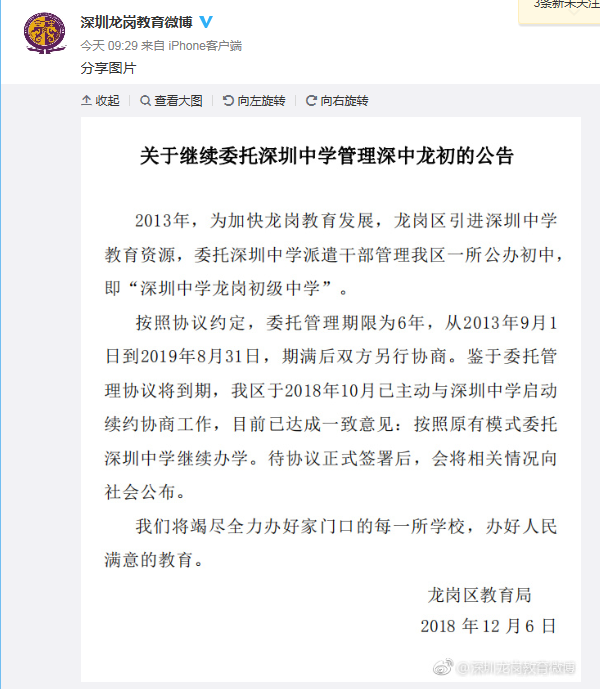 據(jù)了解,從11月底開始,深圳中學將撤離龍崗的消息就在網(wǎng)絡上不脛而走,學區(qū)內(nèi)的業(yè)主在得知這個消息后,有些不知所措,紛紛通過各種渠道打聽消息,有些業(yè)主直接找到龍崗區(qū)教育局求證。12月6日,深圳龍崗教育官方微博發(fā)布公告,目前已達成一致意見:按照原有模式委托深圳中學繼續(xù)辦學。