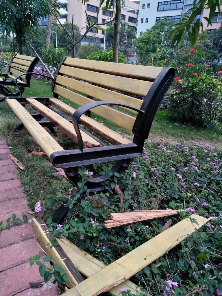公園內(nèi)休閑凳被損壞網(wǎng)友“不是隔壁老王”攝
