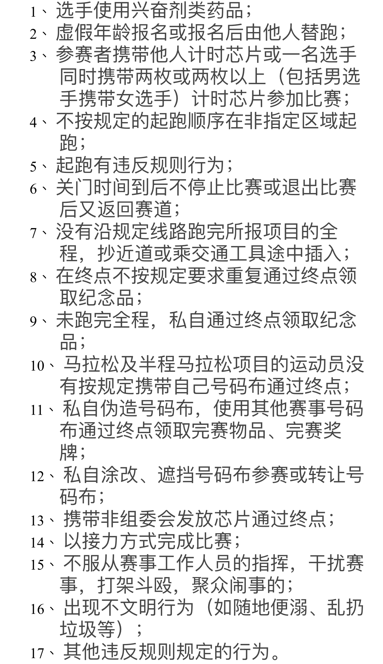 據(jù)悉,在比賽期間選手出現(xiàn)17項(xiàng)違規(guī)行為之一的問題,裁判員有權(quán)中止選手的比賽并當(dāng)場(chǎng)沒收違規(guī)選手的號(hào)碼布及芯片,取消其比賽資格,賽后由組委會(huì)視情節(jié)輕重分別給予參賽選手取消2018深馬比賽成績(jī)、禁賽1至2年,情節(jié)嚴(yán)重者終身禁賽等處罰,并將違規(guī)信息報(bào)送中國田協(xié)申請(qǐng)系列追加處罰。