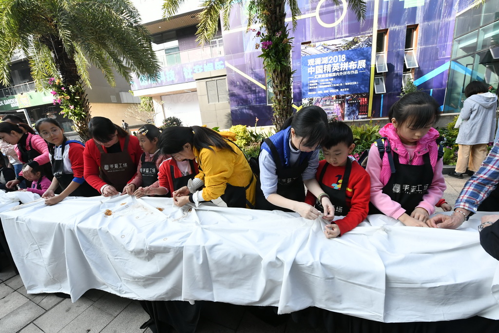 開幕式過后,一場(chǎng)數(shù)百人的非遺藍(lán)染造物派對(duì)在觀瀾湖藝工場(chǎng)文創(chuàng)大道精彩上演。深圳大學(xué)教授、草木藍(lán)兮創(chuàng)始人羅瑩女士帶領(lǐng)大家集體創(chuàng)作“鵬城之藍(lán)”,在參與者體驗(yàn)造物樂趣的同時(shí),也讓傳統(tǒng)手工技藝煥發(fā)新風(fēng)采;從貴州畢節(jié)、黔南遠(yuǎn)道而來的繡娘、非遺傳承人染娘和手工藝?yán)蠋焸?,現(xiàn)場(chǎng)展現(xiàn)了代代相傳的中華植物染工藝;以臺(tái)風(fēng)“山竹”為題材的“芳華”造蟻行動(dòng),通過使用臺(tái)風(fēng)損毀下來的樹枝進(jìn)行再創(chuàng)作,喚起大眾對(duì)自然的敬畏和環(huán)保意識(shí);百人勒杜鵑紙藝花的創(chuàng)作,更是精彩非凡,為改革開放最前沿的深圳獻(xiàn)禮。期間大量市民及游客參與到手工造物的體驗(yàn)中,人人迸發(fā)出巧思和匠心,體現(xiàn)出潛移默化的文化傳承。