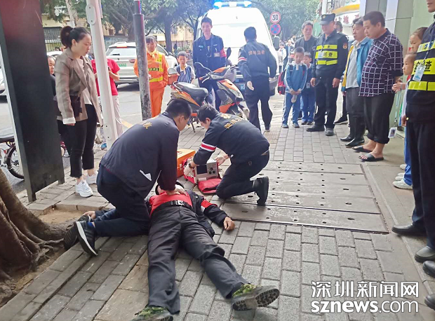 20日上午,福田華富市場(chǎng)附近一名男子突然倒地,呼吸心跳驟停。