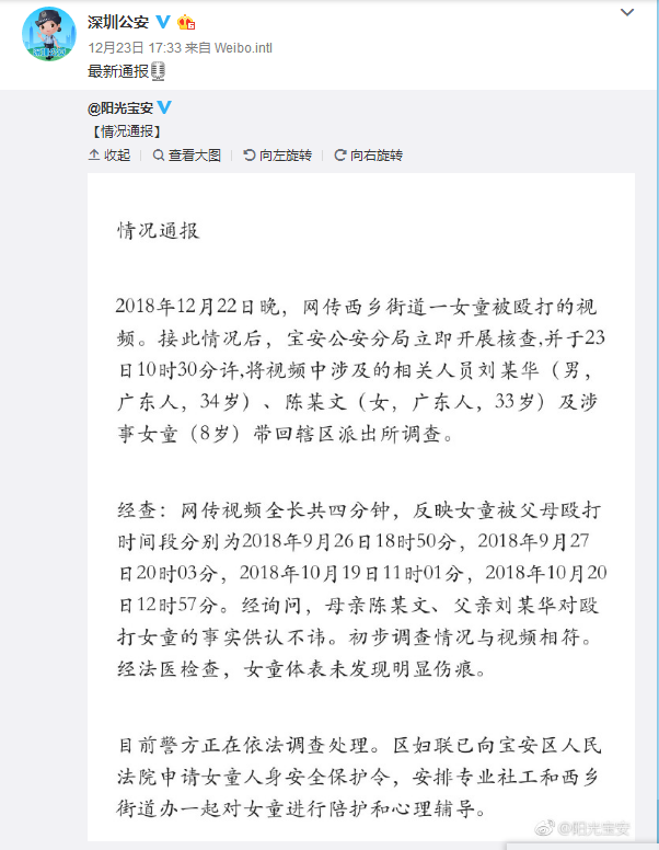 8歲女童遭家暴事件最新消息是,深圳警方對(duì)此展開了調(diào)查處理。寶安區(qū)婦聯(lián)已向?qū)毎矃^(qū)人民法院申請(qǐng)女童人身安全保護(hù)令。寶安公安局的調(diào)查結(jié)果顯示,網(wǎng)上流傳的3分鐘視頻分別是今年9月、10月的四個(gè)時(shí)間段拍攝,女童父母對(duì)毆打女兒的事實(shí)供認(rèn)不諱,法醫(yī)檢查女童體表未發(fā)現(xiàn)明顯傷痕。